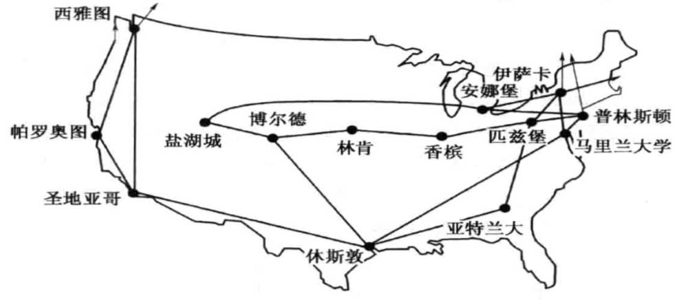 20世纪70 年代后期,美国国家科学基金会NSF   看到 AP RANET  对大学研究工作产生的巨大影响,决定设计一个 ARP ANET  的后继网络,并对所有大学和科研机构开放。1986 年,NSF围绕位千圣地亚哥、博尔德、香嫔、匹堡兹、以及普林斯顿的6 大超级计算中心建立了骨干网并将其命名为 NSFNET 。与 ARPANET 不同,从 建立之初,NSFNET 就选择了 TCP/ IP 协议集作为其标准协议 。NSFN ET 是一个按地区划分的三级网络,当一个用户的计算机与某一地区相连以后,可以访问任何一台超级计算机,并且可以相互通信。NSFNET 骨干网的最初速率只有 56 Kb/ s。1990 年第二代骨干网的速率提升到 1. 544Mh/ s , 即达到了 Tl 速率,并且彻底取代ARPANET成为了Internet 的主干网,如图所示。