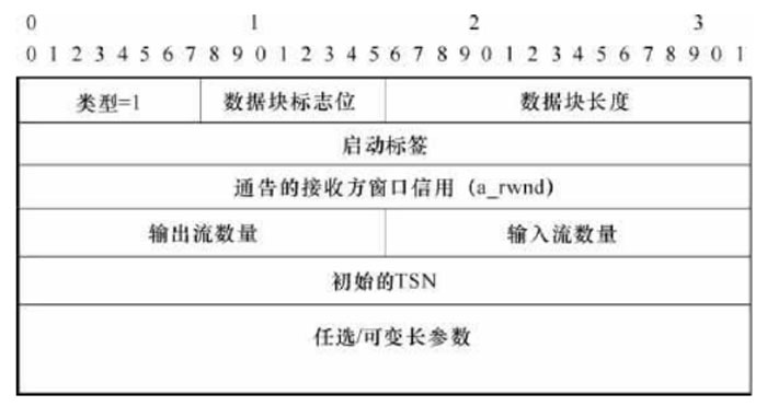 启动INIT数据块用来启动两个SCTP端点间的个偶联。INIT数据块的格式如图所示。