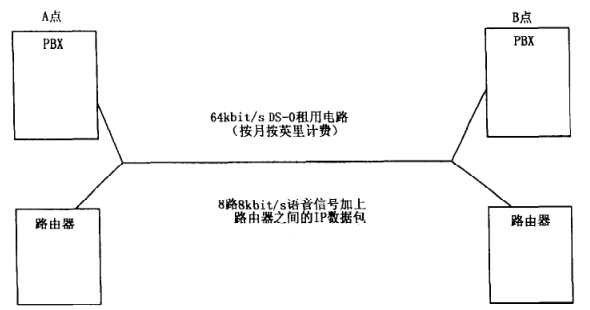 增值业务在商业领域非常普及,但是在住宅用户领域中的应用却没有那么普遍。大多数公司都用局域网和路由器把个人计算机连接起来,许多公司都配有10Base-T的以太局域网。当网络用来传数据时,路由器是站点之间相连的接口设备;当网络用来传语音时,接口设备仍旧是PBX0连接PBX的线路通常是64kbit/s的DS-0的租用专线,也就是连接路由器所用的线路。下图显示了语音和数据是如何共享同一条DS-0的线路带宽。